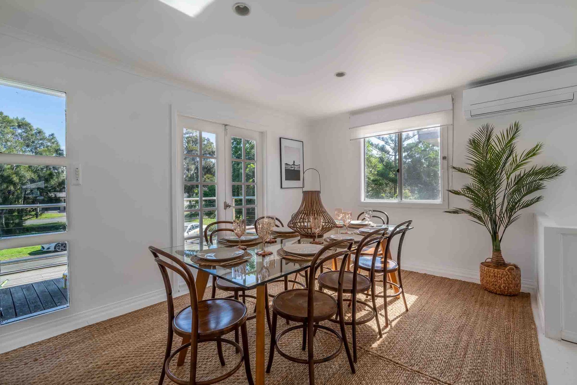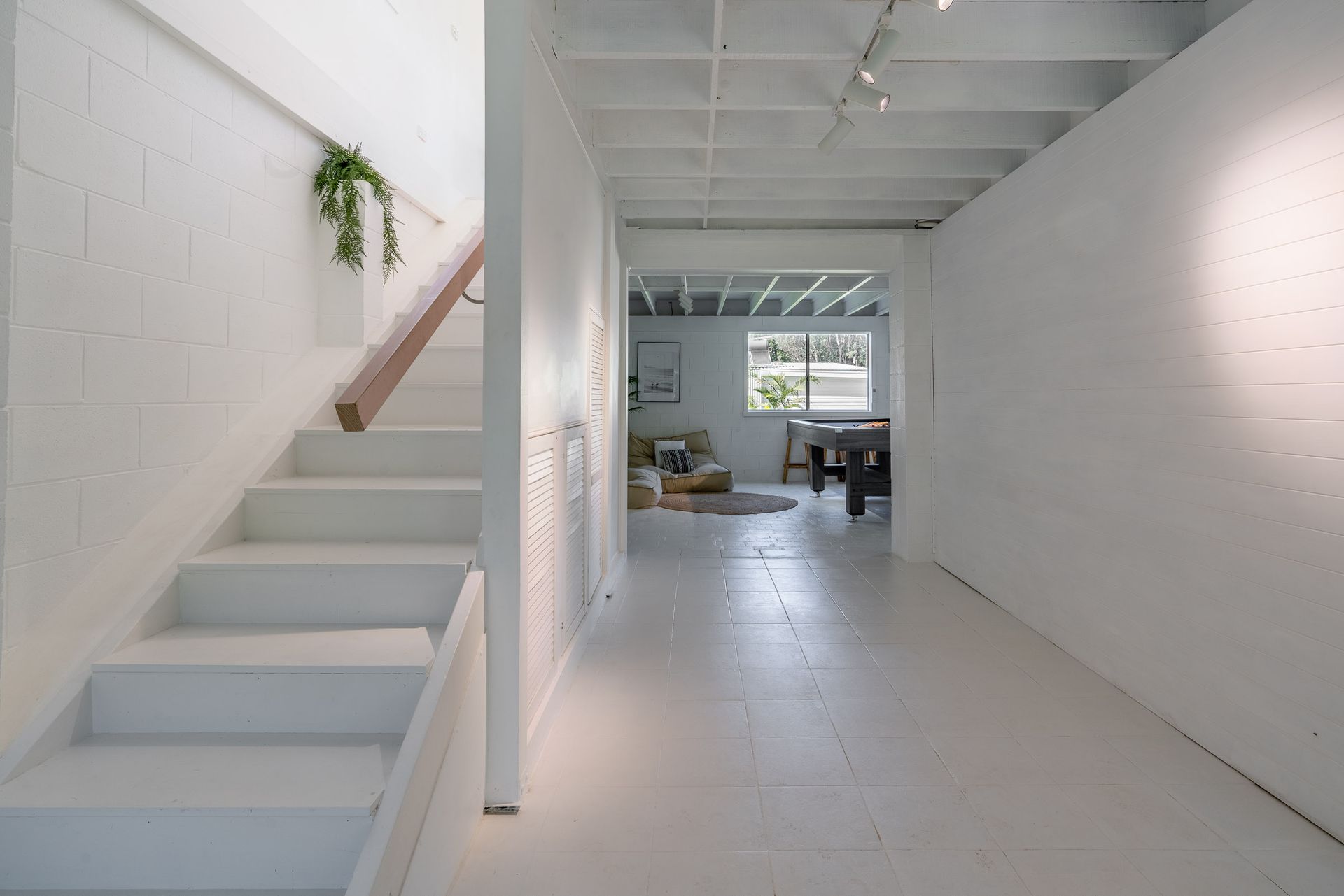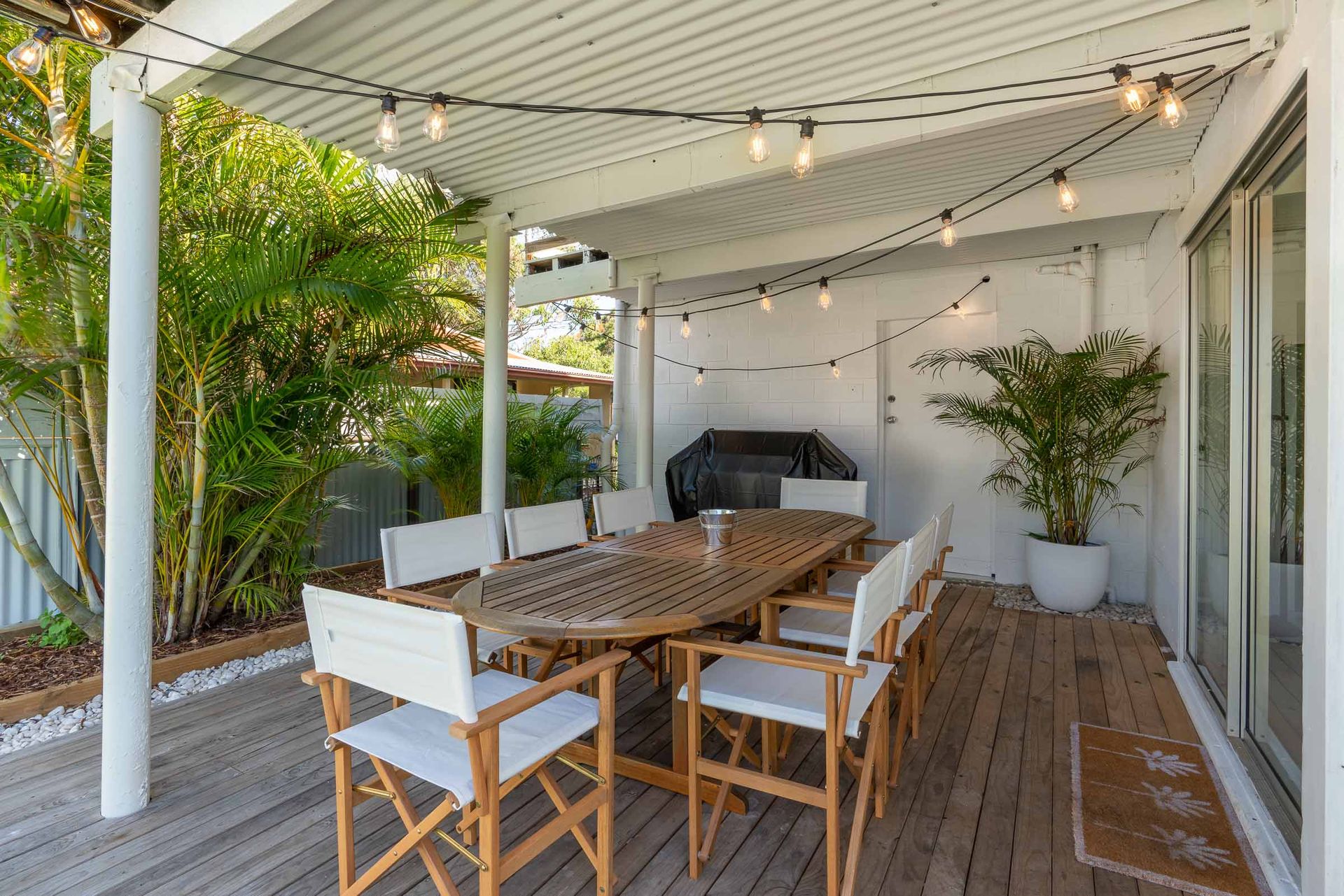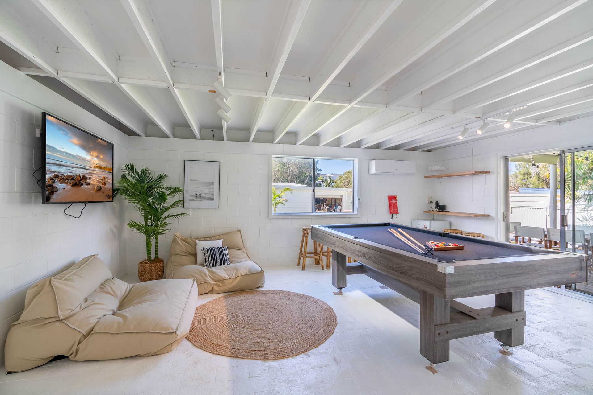 On the ground floor there is a rumpus room containing a pool table, TV and oversized bean bag chairs for lounging. The rumpus room opens onto a back deck with outdoor dining table and bbq.